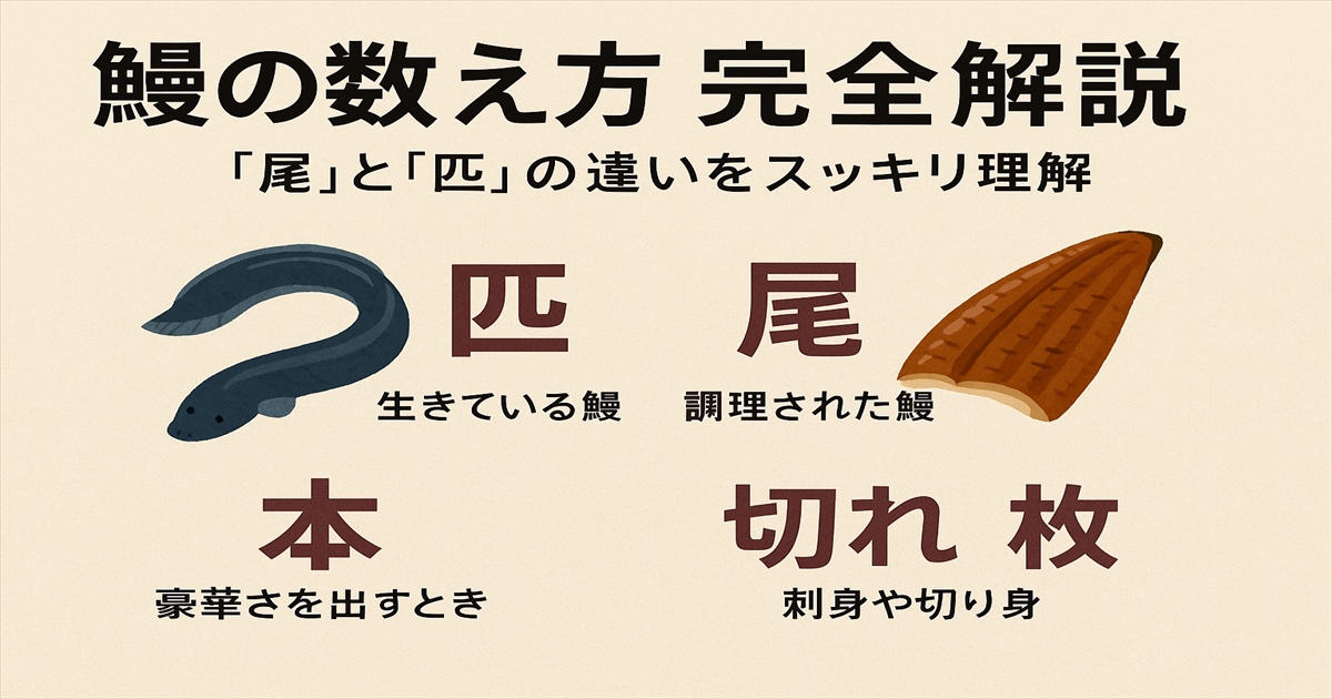この記事では、「尾」「匹」「本」「切れ」など、鰻に使われるさまざまな数え方を一覧表でわかりやすく整理。
